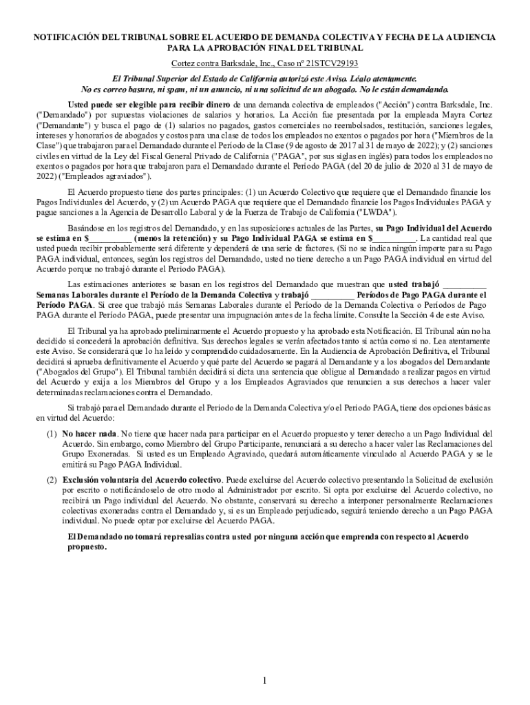 NOTIFICATION DEL TRIBUNAL SORE EL ACTED DE DEMAND COLLECTIVE Y FEC HA DE LA AUDIENCE PARA LA PROBATION FINAL DEL TRIBUNAL Cortez contra Barks dale, Inc., Case n 21STCV29193 El Tribunal Superior del