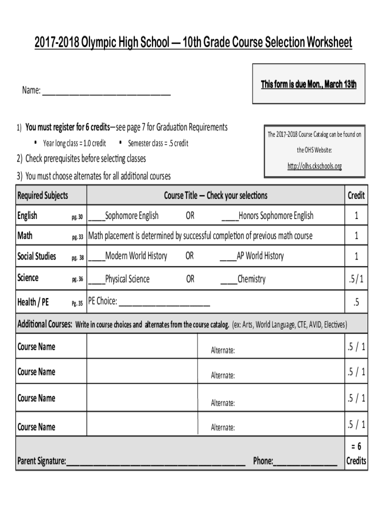 20172018 Olympic High School 10th Grade Course Selection Worksheet This form is due Mon., March 13thName: ___ 1) You must register for 6 credits see page 7 for Graduation Requirements Year long class
