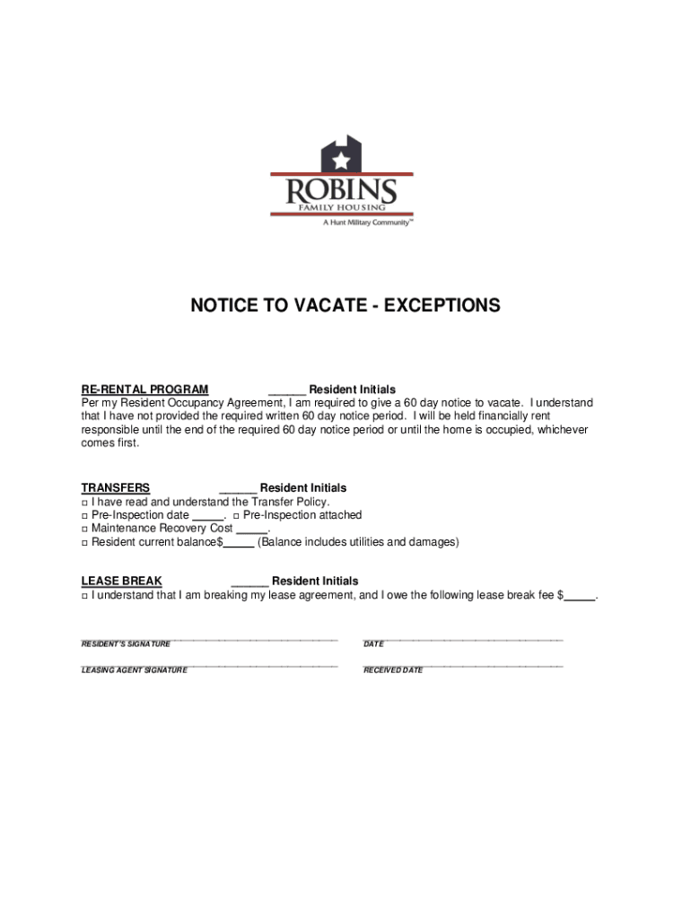 Get the free NOTICE TO VACATE - EXCEPTIONS Robins Family Housing