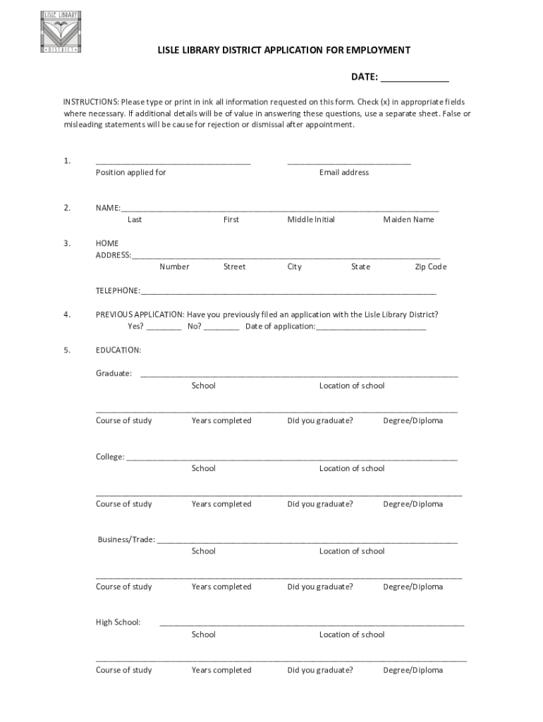 LISLE LIBRARY DISTRICT APPLICATION FOR EMPLOYMENT DATE: ___ INSTRUCTIONS: Please type or print in ink all information requested on this form. Check (x) in appropriate fields where necessary. If additional