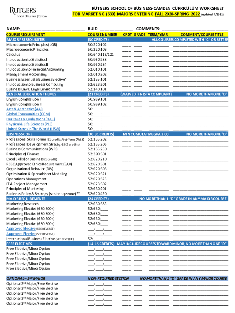 RUTGERS SCHOOL OF BUSINESSMEN CURRICULUM WORKSHEET FOR MARKETING (630) MAJORS ENTERING FALL 2020SPRING 2022 (updated 4/2021) NAME:___ RAID: ___ COMMENTS: ___COURSE REQUIREMENT MAJOR PREREQUISITES