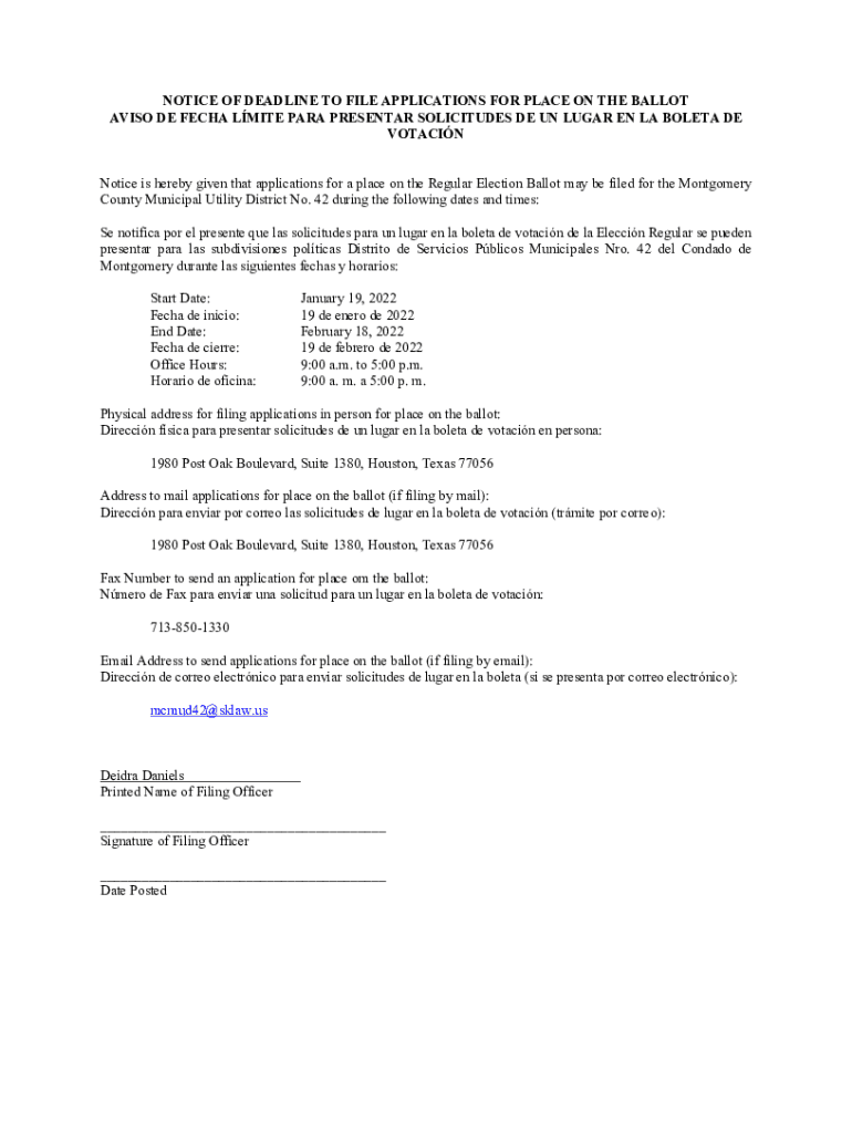 NOTICE OF DEADLINE TO FILE APPLICATIONS FOR PLACE ON THE BALLOT