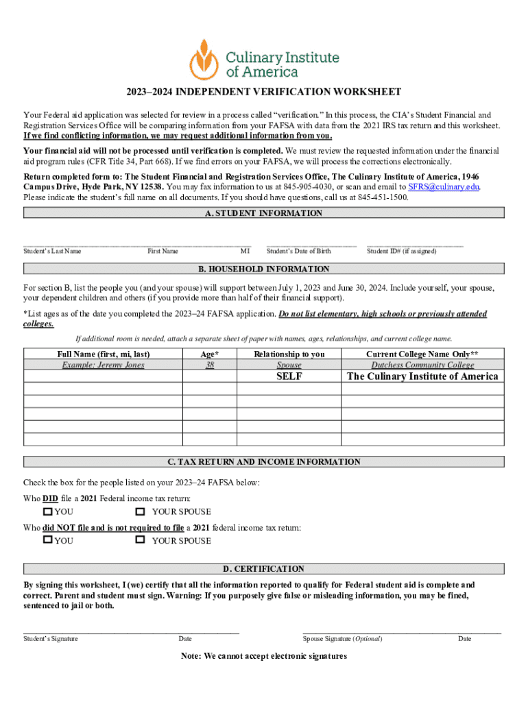 20232024 INDEPENDENT VERIFICATION WORKSHEET Your Federal aid application was selected for review in a process called verification. In this process, the CIA's Student Financial and Registration Services