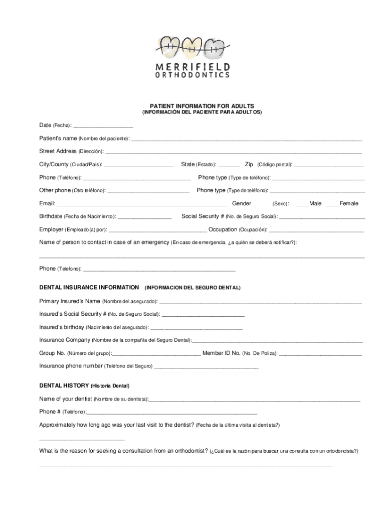 PATIENT INFORMATION FOR ADULTS (INFORMATION DEL PATIENTS PARA ADULTS)Date (Tech): ___ Patients name (Hombre Del patients): ___ Street Address (Direction): ___ City/County (Ciudad/Pas): ___State (Est