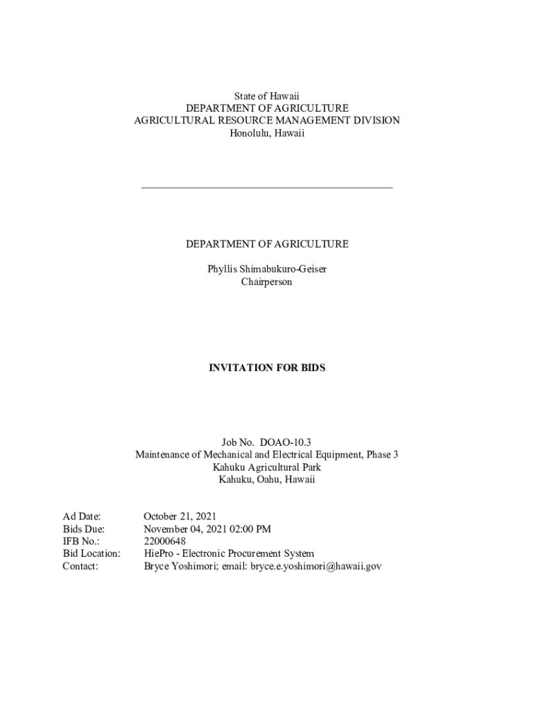 State of Hawaii DEPARTMENT OF AGRICULTURE AGRICULTURAL RESOURCE MANAGEMENT DIVISION Honolulu, Hawaii___DEPARTMENT OF AGRICULTURE Phyllis ShimabukuroGeiser ChairpersonINVITATION FOR BIDS Job No. DOAO10.3