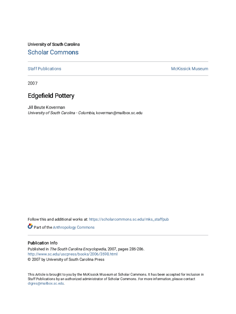 University of South CarolinaScholar Commons Staff PublicationsMcKissick Museum2007Edgefield Pottery Jill Brute Overran University of South Carolina Columbia, koverman@mailbox.sc.eduFollow this and