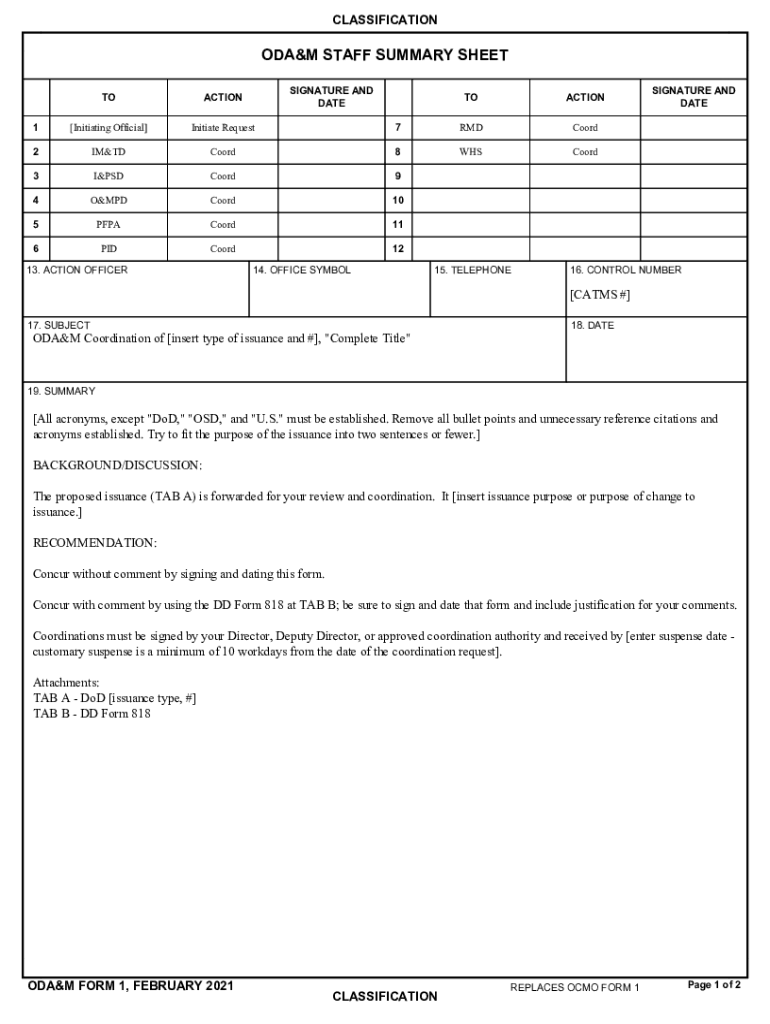 CLASSIFICATIONODA&M STAFF SUMMARY SHEET SIGNATURE AND DATETOACTIONTOACTION1[Initiating Official]Initiate Request7RMDCoord2IM&TDCoord8WHSCoord3I&PSDCoord94O&MPDCoord105PFPACoord116PIDCoord1213. ACTION
