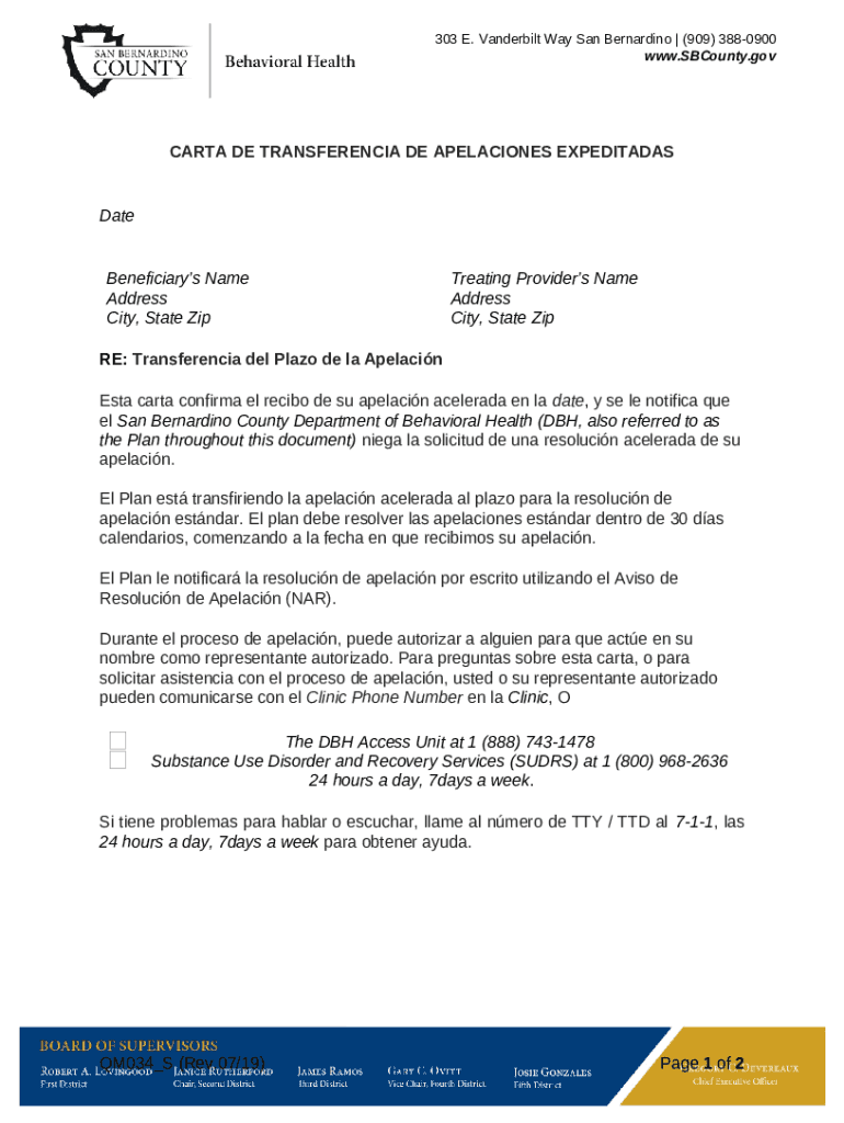 Template CARTA DE TRANSFERENCIA DE APELACIONES EXPEDITADAS instructions