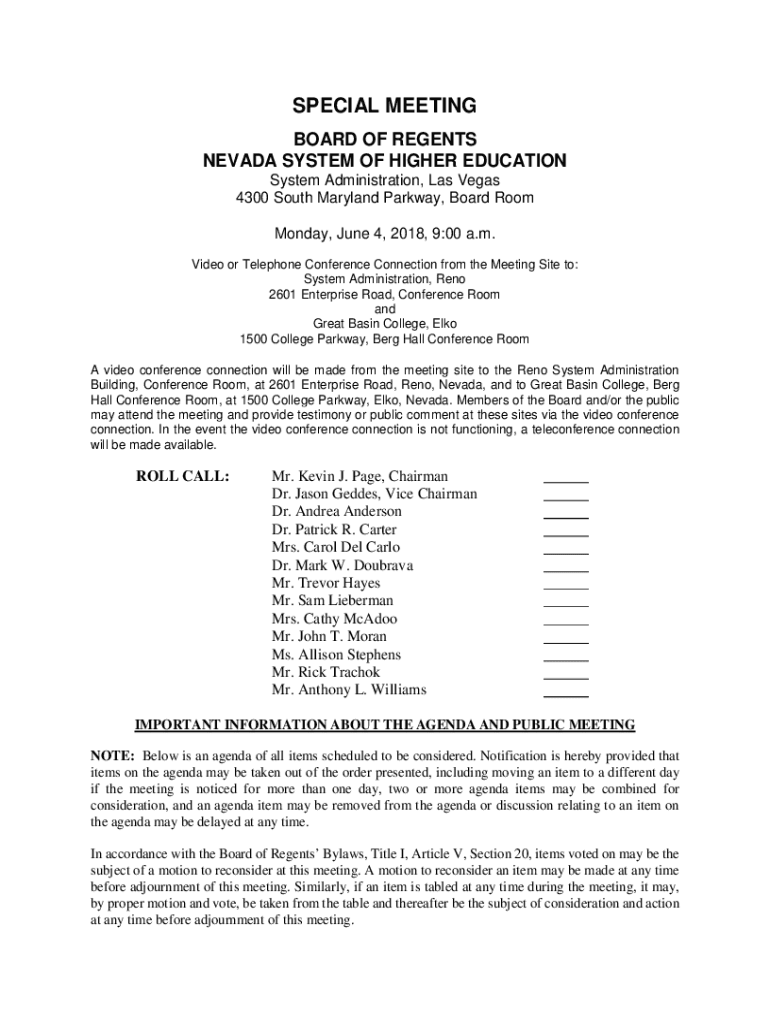 SPECIAL MEETING BOARD OF REGENTS NEVADA SYSTEM OF HIGHER EDUCATION System Administration, Las Vegas 4300 South Maryland Parkway, Board Room Monday, June 4, 2018, 9:00 a.m. Video or Telephone Conference