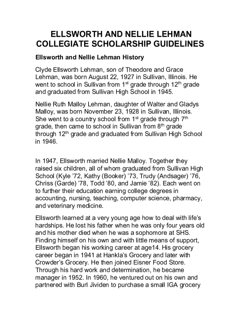 ELLSWORTH AND NELLIE LEHMAN COLLEGIATE SCHOLARSHIP GUIDELINES Ellsworth and Nellie Lehman History Clyde Ellsworth Lehman, son of Theodore and Grace Lehman, was born August 22, 1927, in Sullivan, Illinois.