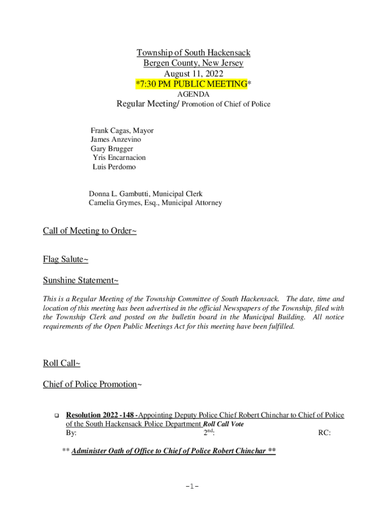 Township of South Hackensack Bergen County, New Jersey August 11, 2022 ×7:30 PM PUBLIC MEETING* AGENDA Regular Meeting/ Promotion of Chief of Police Frank Cages, Mayor James Angevin Gary Rugger Iris