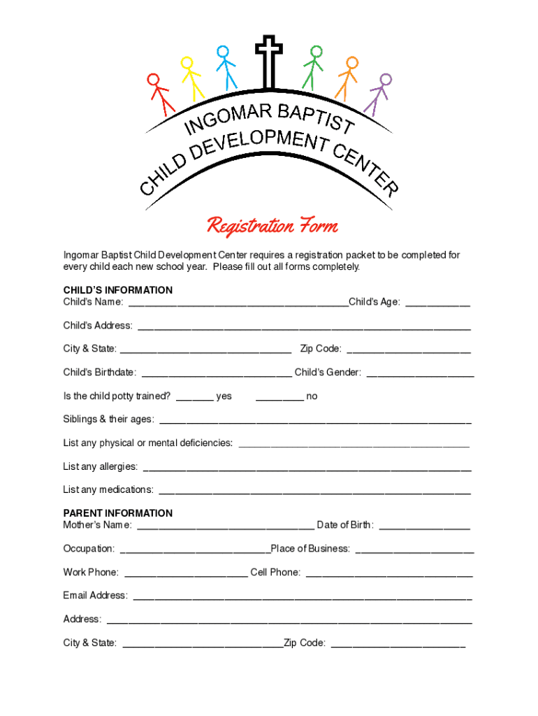 Registration Form Insofar Baptist Child Development Center requires a registration packet to be completed for every child each new school year. Please ll out all forms completely. CHILD INFORMATION