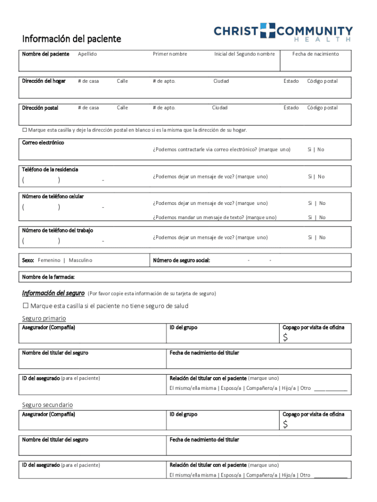 Information Del patients Hombre Del pacienteApellidoDireccin Del Hagar# de casaDireccin postal# de casaPrimer nombreInicial Del Segundo nombreFecha de nacimientoCalle# DE auto. CiudadEstadoCdigo postalCalle#