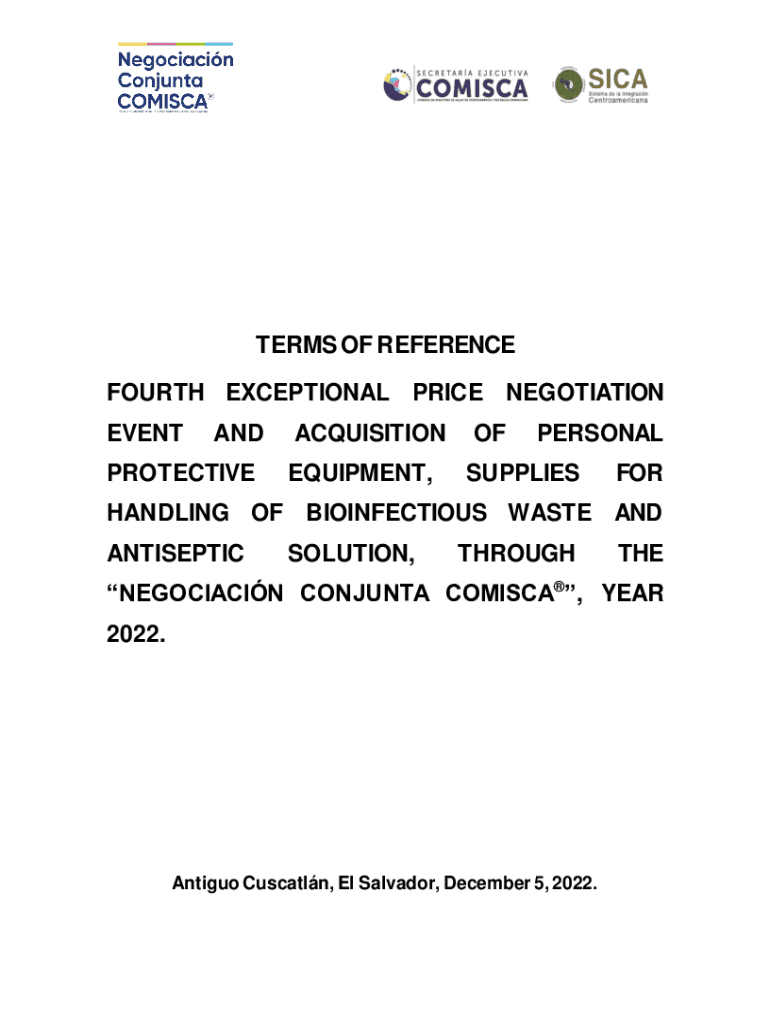 TERMS OF REFERENCE FOURTH EXCEPTIONAL PRICE NEGOTIATION EVENTANDPROTECTIVEACQUISITION EQUIPMENT, OFPERSONALSUPPLIESFORHANDLING OF INFECTIOUS WASTE AND ANTISEPTICSOLUTION, THROUGHTHENEGOCIACIN CONJUNCT