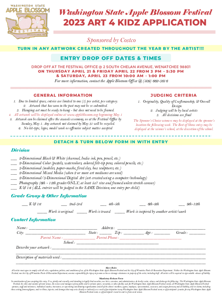 Washington State Apple Blossom Festival2023 ART 4 KIDS APPLICATION Sponsored by Costco TURN IN ANY ARTWORK CREATED THROUGHOUT THE YEAR BY THE ARTIST!!!ENTRY DROP OFF DATES & TIMES DROP OFF AT THE