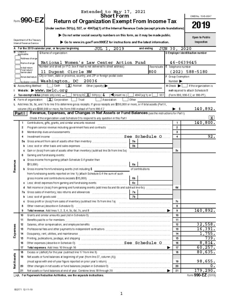 Extended to May 17, 2021Form990EZShort Form Return of Organization Exempt From Income Tax OMB No. 15450047Under section 501(c), 527, or 4947(a)(1) of the Internal Revenue Code (except private foundations)