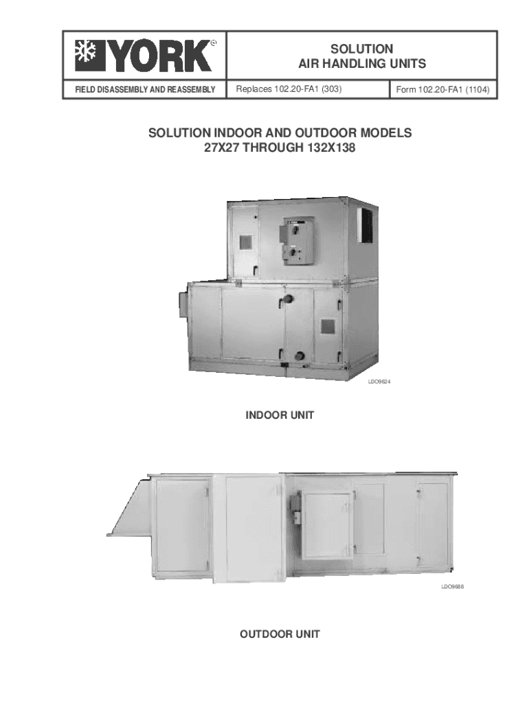SOLUTION AIR HANDLING UNITS FIELD DISASSEMBLY AND REASSEMBLYReplaces 102.20FA1 (303)Form 102.20FA1 (1104)SOLUTION INDOOR AND OUTDOOR MODELS 27×27 THROUGH 132×138LDO9624INDOOR UNITLDO9688OUTDOOR