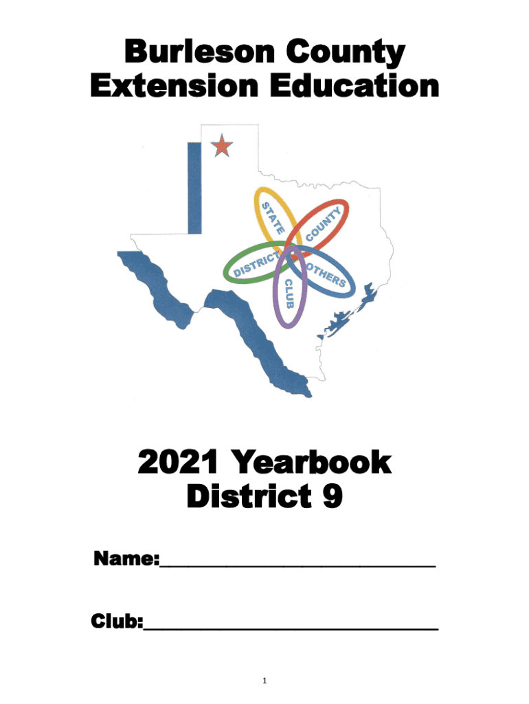 Burleson County Extension Education2021 Yearbook District 9 Name:___ Club:___ 1Table of Contents3TEEA Purpose, Pledge, Prayer, Creed, Motto, Closing Prayer, Mission4Vision, Core, Values, Pledge of