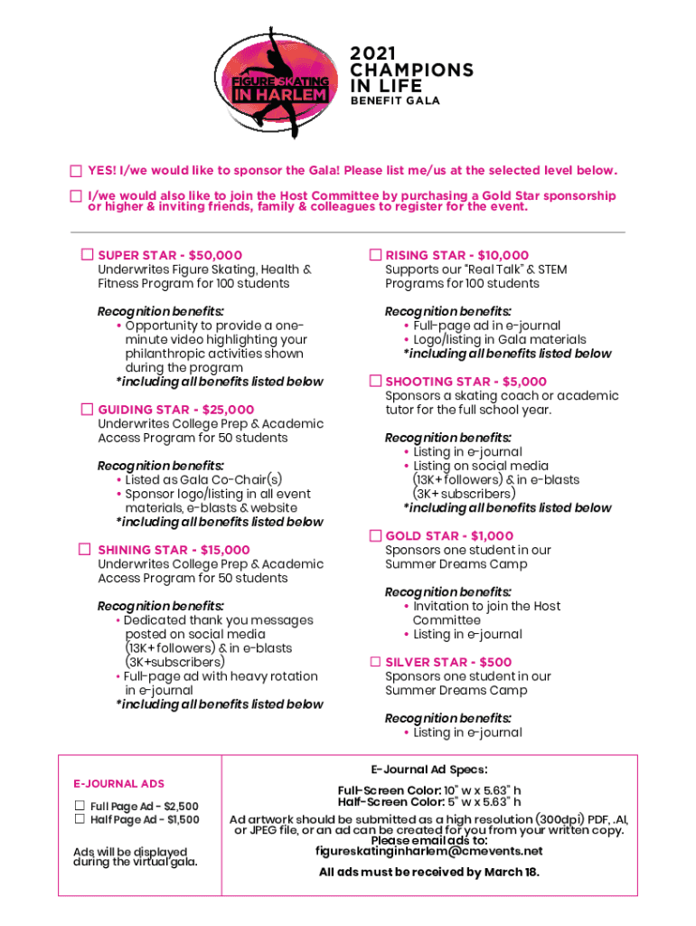 2021 CHAMPIONS IN LIFE BENEFIT GALAXIES! I/we would like to sponsor the Gala! Please list me/us at the selected level below. I/we would also like to join the Host Committee by purchasing a Gold Star