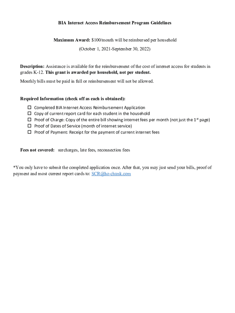 BIA Internet Access Reimbursement Program GuidelinesMaximum Award: $100/month will be reimbursed per household (October 1, 2021September 30, 2022)Description: Assistance is available for the reimbursement