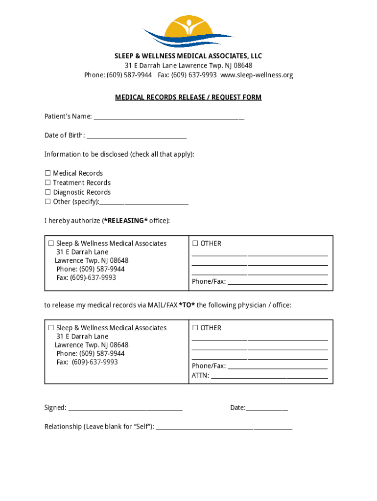 SLEEP & WELLNESS MEDICAL ASSOCIATES, LLC 31 E Darragh Lane Lawrence Twp. NJ 08648 Phone: (609) 5879944 Fax: (609) 6379993 www.sleepwellness.org MEDICAL RECORDS RELEASE / REQUEST FORM Patients Name: