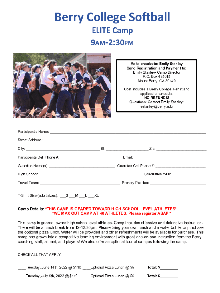 Berry College Softball ELITE Camp 9AM2:30PMMake checks to: Emily Stanley Send Registration and Payment to: Emily Stanley Camp Director P.O. Box 495015 Mount Berry, GA 30149 Cost includes a Berry College
