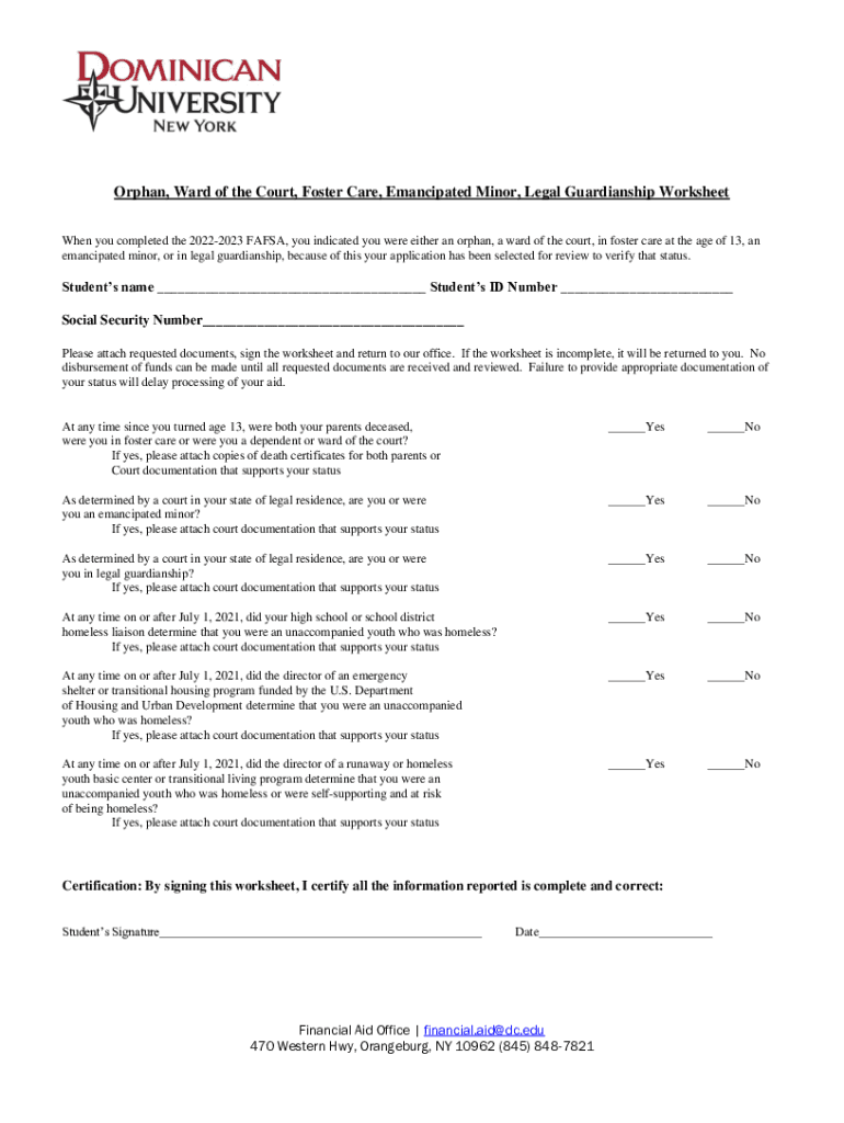 Orphan, Ward of the Court, Foster Care, Emancipated Minor, Legal Guardianship Worksheet When you completed the 20222023 FAFSA, you indicated you were either an orphan, a ward of the court, in foster