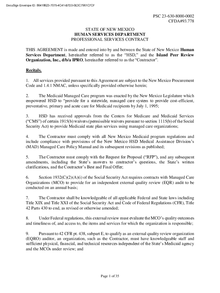 DocuSign Envelope ID: 8641862370754C41B7D30E3C7961C7CFPSC 2363080000002 CODA#93.778 STATE OF NEW MEXICO HUMAN SERVICES DEPARTMENT PROFESSIONAL SERVICES CONTRACT THIS AGREEMENT is made and entered