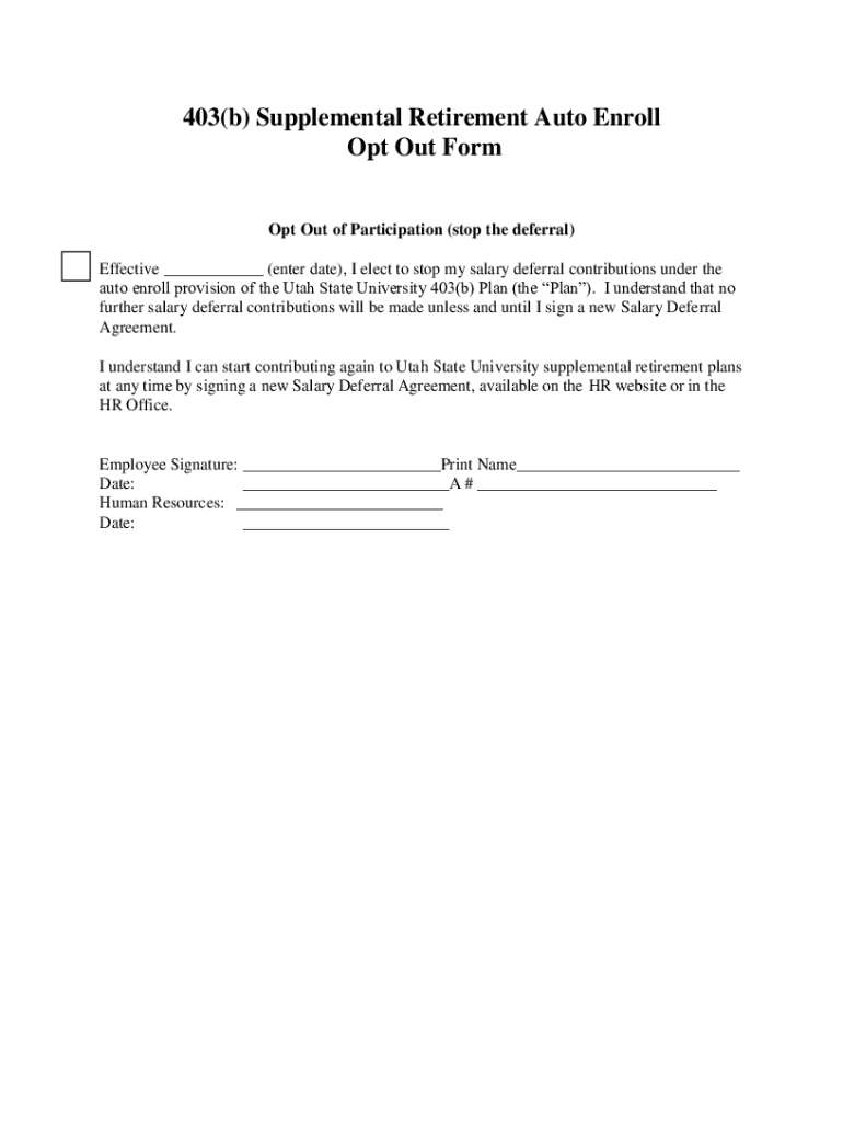 403(b) Supplemental Retirement Auto Enroll Opt-Out Form Opt Out of Participation (stop the deferral) Effective ___ (enter date), I elect to stop my salary deferral contributions under the auto enroll