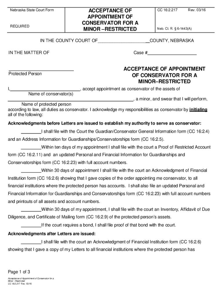 Nebraska State Court FormREQUIREDACCEPTANCE OF APPOINTMENT OF CONSERVATOR FOR A MINOR RESTRICTED CC 16:2.217Rev. 03/16Neb. Ct. R. 61443(A)IN THE COUNTY COURT OF___ COUNTY, NEBRASKA IN THE MATTER Protected