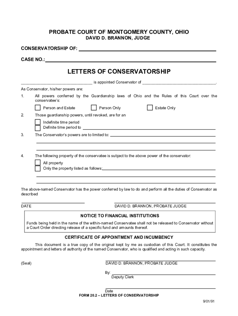 PROBATE COURT OF MONTGOMERY COUNTY, OHIO DAVID D. BRANNON, JUDGECONSERVATORSHIP OF: CASE NO.:LETTERS OF CONSERVATORSHIP ___ is appointed Conservator of ___. As Conservator, his/her powers are: 1.