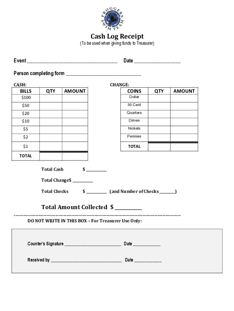 CashLogReceipt (To be used when giving funds to Treasurer)Event ___Date ___Person completing form ___ CASH:BILLSQTY$$21TOTAL