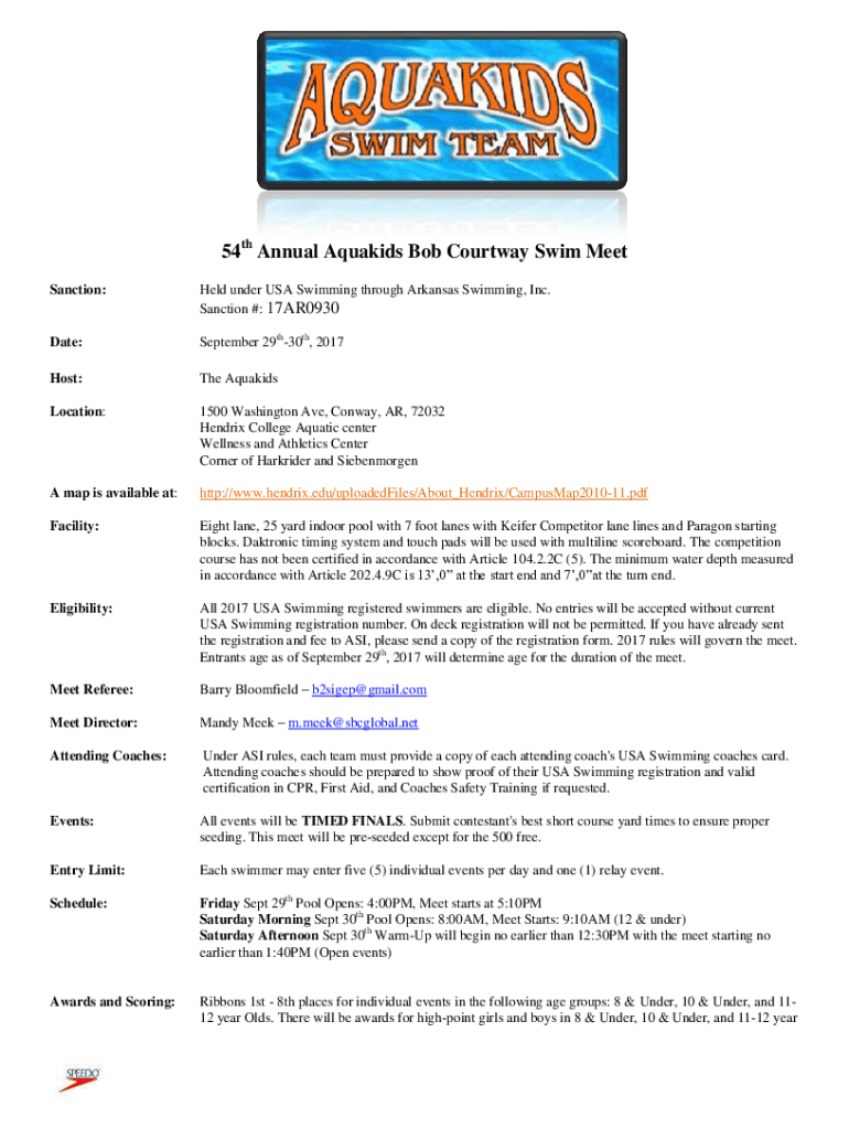 54th Annual Aqua kids Bob Court way Swim Meet Sanction:Held under USA Swimming through Arkansas Swimming, Inc. Sanction #: 17AR0930Date:September 29th30th, 2017Host:The AquakidsLocation:1500 Washington