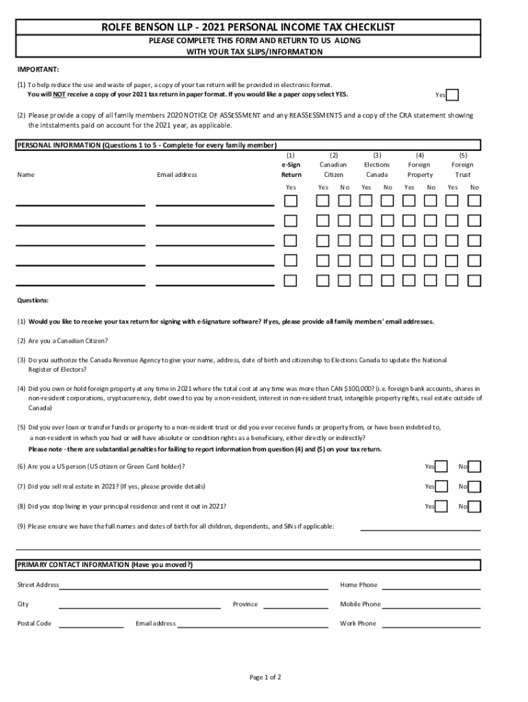 ROLE BENSON LLP 2021 PERSONAL INCOME TAX CHECKLIST PLEASE COMPLETE THIS FORM AND RETURN TO US ALONG WITH YOUR TAX SLIPS/INFORMATION IMPORTANT: (1) To help reduce the use and waste of paper, a copy