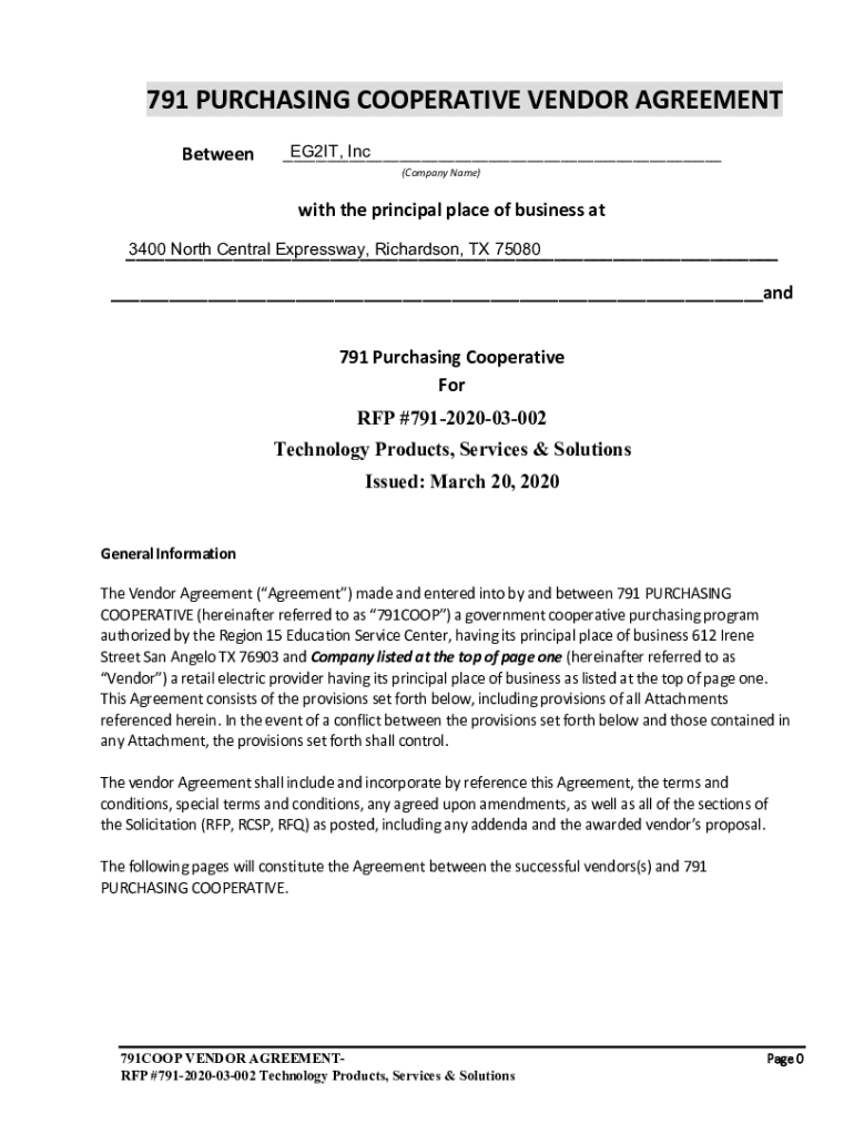 791 PURCHASING COOPERATIVE VENDOR AGREEMENT BetweenEG2IT, Inc ___ (Company Name)with the principal place of business at 3400 North Central Expressway, Richardson, TX 75080 ______and 791 Purchasing