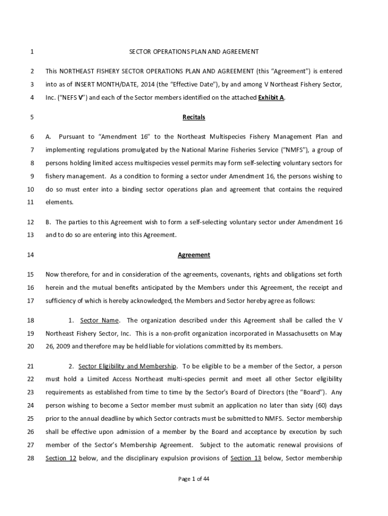 1SECTOR OPERATIONS PLAN AND AGREEMENT2This NORTHEAST FISHERY SECTOR OPERATIONS PLAN AND AGREEMENT (this Agreement) is entered3into as of INSERT MONTH/DATE, 2014 (the Effective Date), by and among