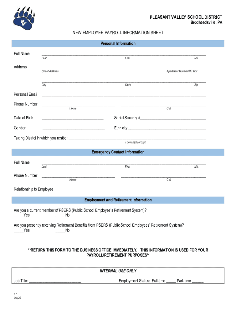 PLEASANT VALLEY SCHOOL DISTRICT Brodheadsville, PANEL EMPLOYEE PAYROLL INFORMATION SHEET Personal Information Full Name___ LastAddressFirstM. I.___ Street AddressApartment Number/PO Box___ CityStateZipPersonal