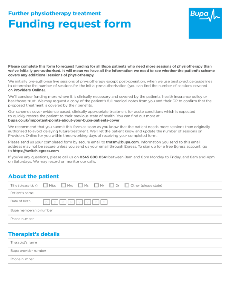 Further physiotherapy treatmentFunding request formulas complete this form to request funding for all BPA patients who need more sessions of physiotherapy than we've initially preauthorized. It will