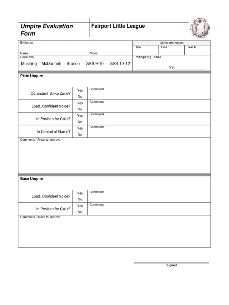 Airport Little LeagueUmpire Evaluation Form EvaluatorDate Name Circle one:Game information Time Field #Phone Participating TeamsMustangMcDonnellBroncoGSB 910GSB 1012___ vs. ___Plate UmpireConsistent
