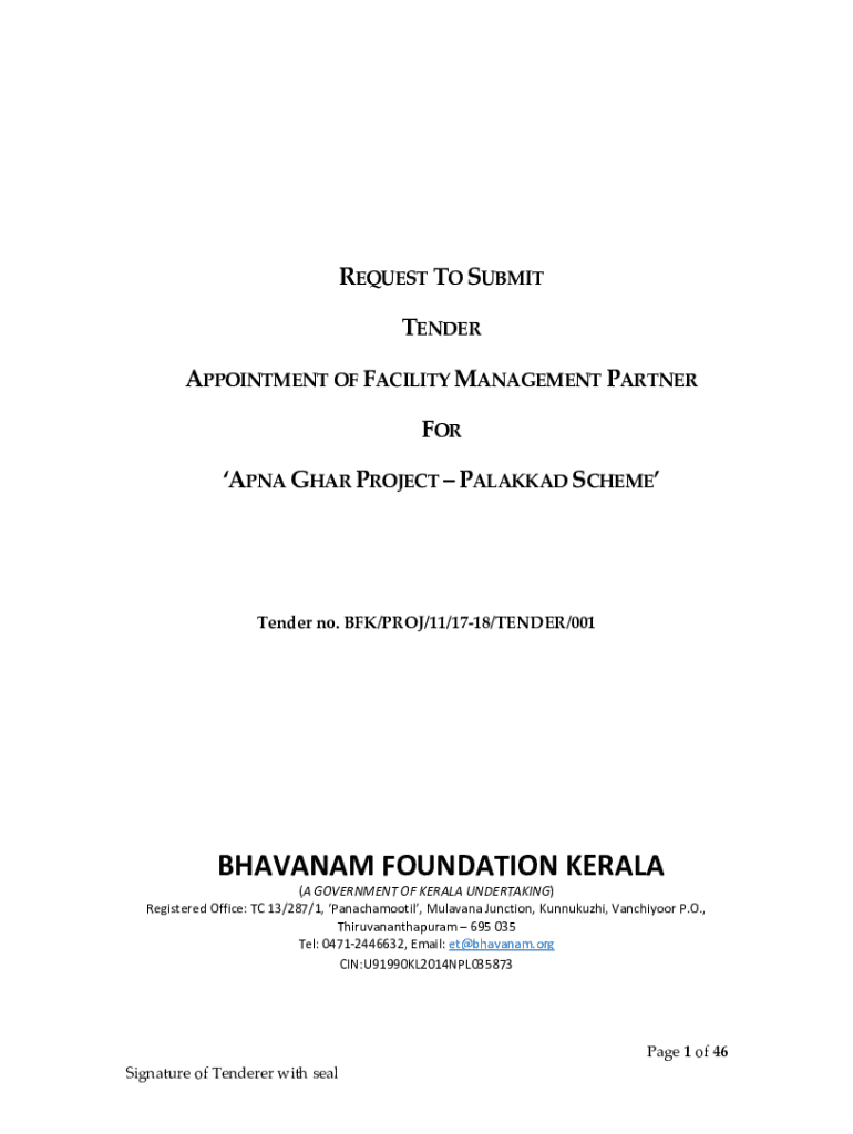 REQUEST TO SUBMIT TENDER APPOINTMENT OF FACILITY MANAGEMENT PARTNER FOR ANNA GEAR PROJECT ALASKA SCHEMETender no. BFK/PRO/11/1718/TENDER/001BHAVANAM FOUNDATION KERALA (A GOVERNMENT OF KERALA UNDERTAKING)