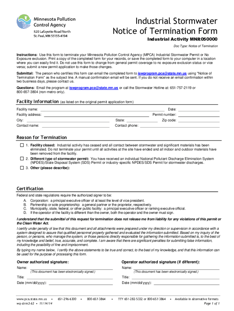 Industrial Stormwater Notice of Termination Form Industrial Activity MNR050000 Doc Type: Notice of TerminationInstructions: Use this form to terminate your Minnesota Pollution Control Agency (MPA)