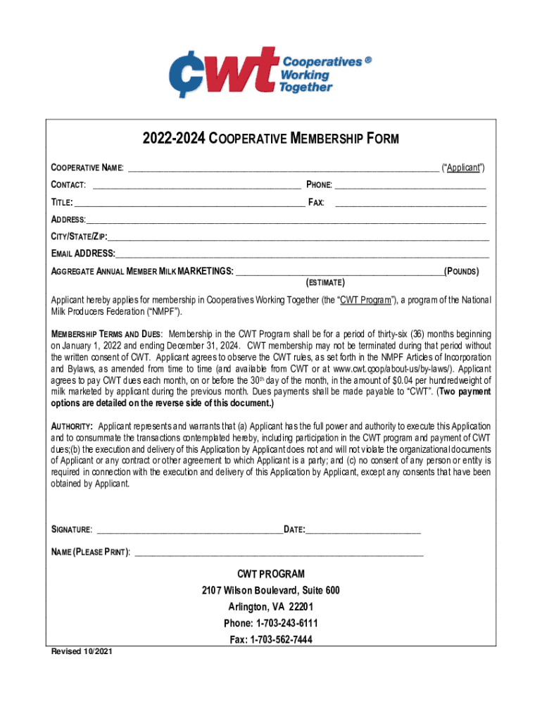 20222024 COOPERATIVE MEMBERSHIP FORM COOPERATIVE NAME: ___ (Applicant) CONTACT: ___ PHONE: ___ TITLE: ___ FAX:___ADDRESS:___ CITY/STATE/ZIP:___ EMAIL ADDRESS:___ AGGREGATE ANNUAL MEMBER MILK MARKETING: