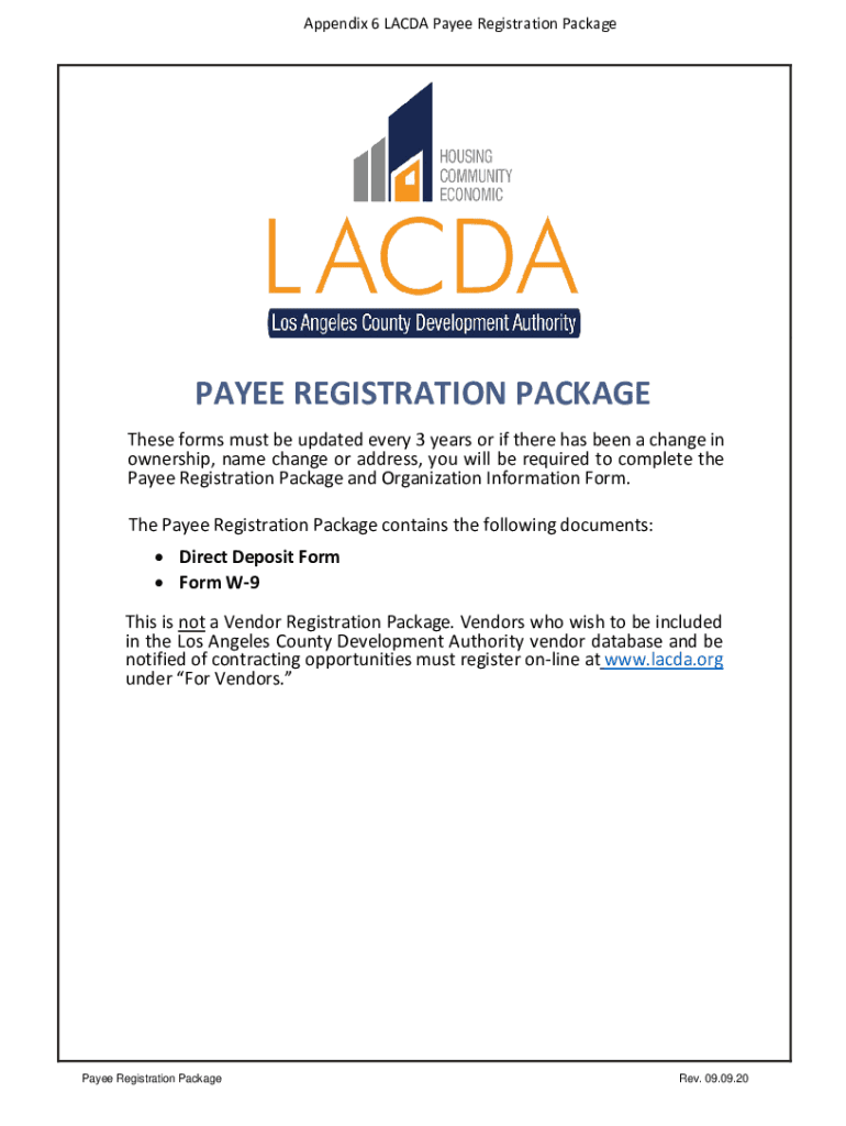 Appendix 6 LACMA Payee Registration PackagePAYEE REGISTRATION PACKAGE These forms must be updated every 3 years or if there has been a change in ownership, name change or address, you will be required