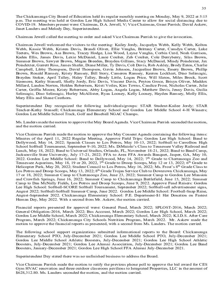 35 The Chickamauga City Board of Education held its regular monthly meeting on Monday, May 9, 2022, at 5:15 p.m. The meeting was held at Gordon Lee High School Media Center to allow for social distancing