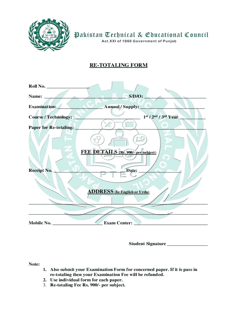 TOTALING Formerly No. ___ Name: ___ S/D/O: ___ Examination: ___ Annual / Supply: ___ Course / Technology: ___ 1st / 2nd / 3rd Year ___ Paper for Re totaling: ___FEE DETAILS (Rs. 900/ per subject)Receipt