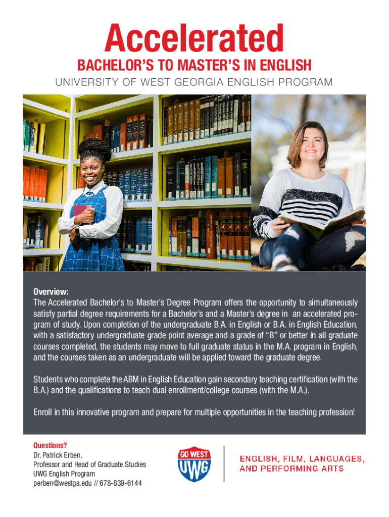AcceleratedBACHELORS TO MASTERS IN ENGLISH UNIVERSITY OF WEST GEORGIA ENGLISH PROGRAMProgram Information & Application The Accelerated Bachelors to Master’s Degree Program in English at the University
