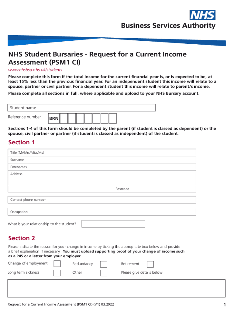 NHS Student Bursaries Request for a Current Income Assessment (PSM1 CI) www.nhsbsa.nhs.uk/students Please complete this form if the total income for the current financial year is, or is expected to