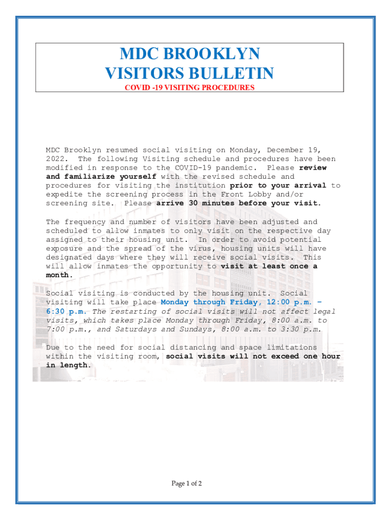 MDC BROOKLYN VISITORS BULLETIN COVID-19 VISITING PROCEDURES MDC Brooklyn resumed social visiting on Monday, December 19, 2022. The following Visiting schedule and procedures have been modified in