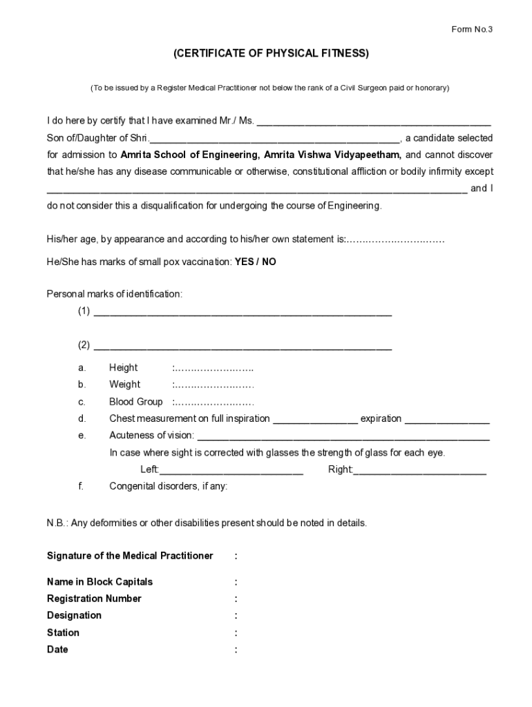 Form No.3(CERTIFICATE OF PHYSICAL FITNESS) (To be issued by a Register Medical Practitioner not below the rank of a Civil Surgeon paid or honorary)I do here by certify that I have examined Mr./ Ms.