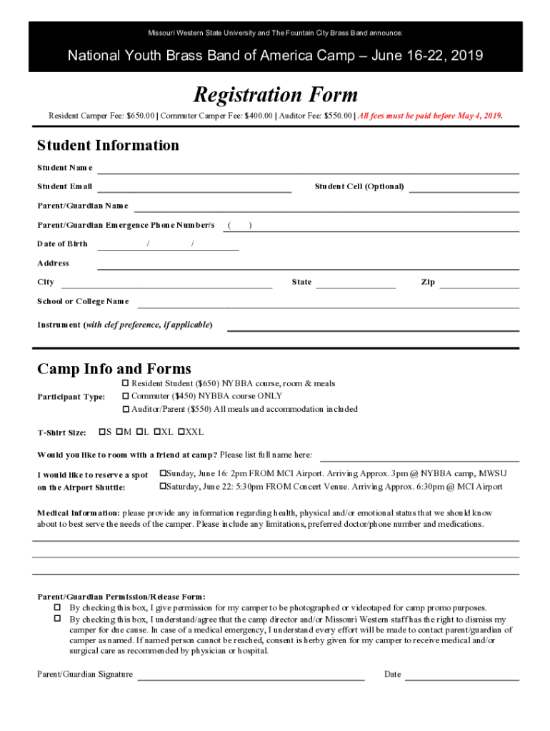 Missouri Western State University and The Fountain City Brass Band announce:National Youth Brass Band of America Camp June 1622, 2019Registration Form